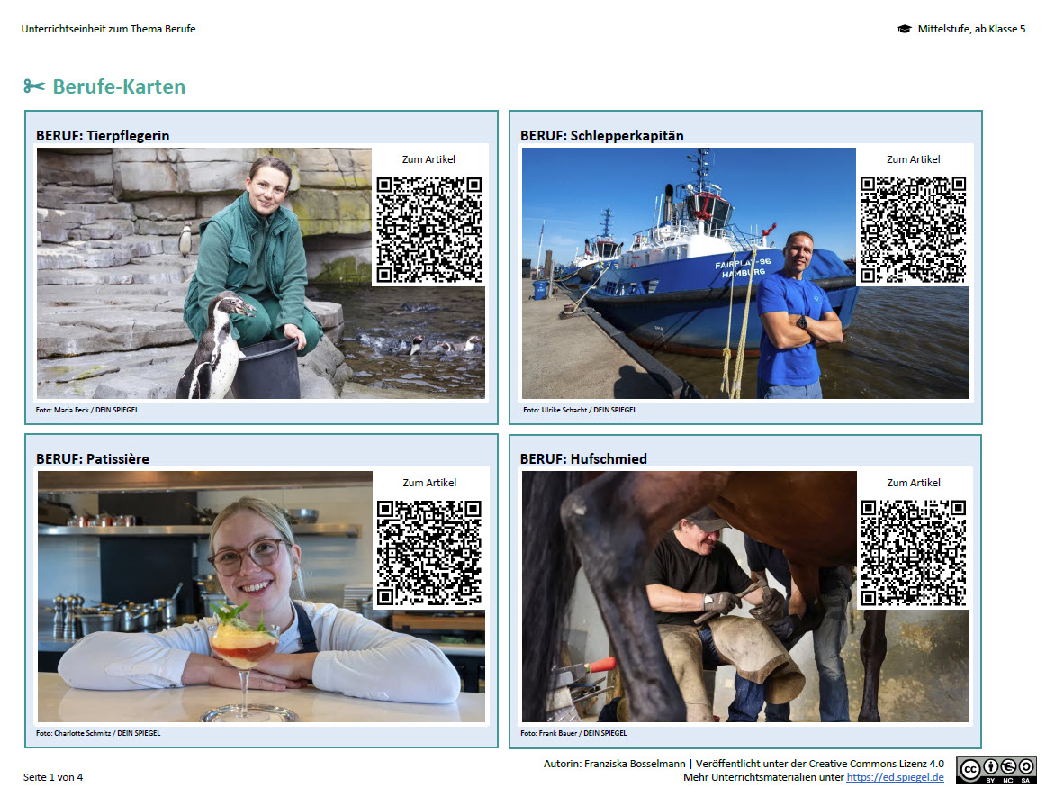 Zur Autorin: Franziska Bosselmann ist freie Medienpädagogin und lebt in Frankfurt am Main. Sie studierte Theater-, Film- und Medienwissenschaften (M.A.) und ist seit 2015 als Trainerin und Konzeptentwicklerin für die medienblau gGmbH tätig. Diese Unterrichtseinheit basiert auf einem Dossier zum Thema »Berufe« aus DEIN-SPIEGEL-Artikeln aus dem Jahr 2025.